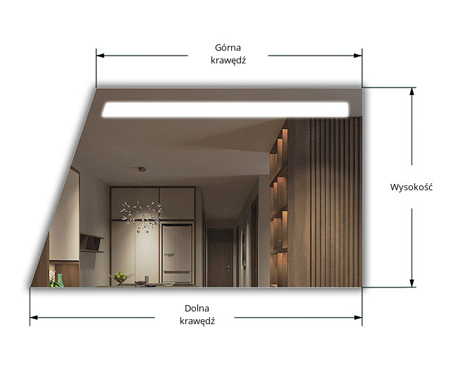 Fazowana krawędź lustrzanej tafli. Szerokość cięcia 22 mm. Piękna, szlachetna dekoracja. Gra świateł tworzy